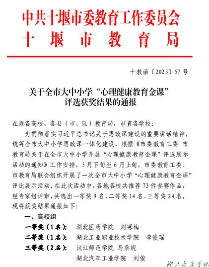 为贯彻落实习近平总书记关于思政课建设的重要讲话精神,统筹全市大中小学思政课一体化建设,2023年5月下旬至6月上旬,十堰市委教育工委、市教育局联合组织开展了全市大中小学“心理健康教育金课”评比展示活动。在此次活动中,各地各校共推荐 73 件参赛作品,经专家组评审,共选出一等奖 9 名、二等奖 14 名、三等奖 24 名。