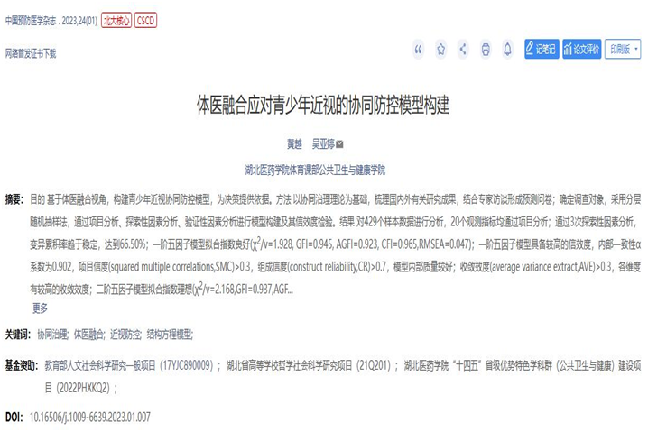 本网讯(通讯员 黄越)英国上市公司365,英国上市公司365体育课部一直关注“体医融合”对不同人群的健康促进研究。近日,黄越团队最新研究成果“体医融合应对青少年近视的协同防控模型构建Construction of integrated physical and medicalcare model forthe prevention and control of adolescent myopia”解析了“体医融合”应对青少年近视的多维影响因素及协同作用。发表在《中国预防医学杂志》(中国高质量科技期刊T3类),体育课部吴亚婷老师为通讯作者。
