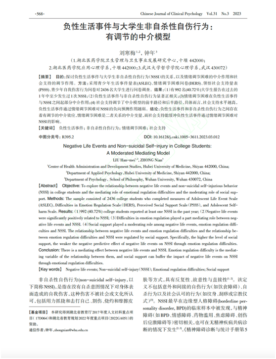 本网讯(通讯员 朱明一)英国上市公司365,英国上市公司365应用心理学系一直关注大学生的心理健康素养研究。近日,刘寒梅老师的科研成果“负性生活事件与大学生非自杀性自伤:一个有调节的中介模型”发表在《中国临床心理学杂志》(CSSCI)。该文主要探讨了负性生活事件与大学生非自杀性自伤的关系及其情绪调节困难和社会支持在其中的作用机制。