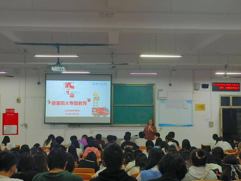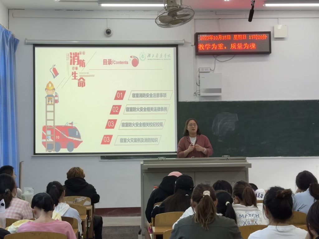 辅导员韩丽萍从寝室消防安全注意事项、寝室防火安全相关法律条例、寝室防火安全相关校纪校规、寝室火灾案例及消防知识四个方面展开讲解,告诫同学们造成寝室起火的原因有两个,一是违规使用明火,二是违规使用持续发热大功率电器或老化电器。提醒同学们宿舍防火要做到“四不”:不在寝室存放易燃易爆物品、不使用违规电器、不在寝室吸烟、不在宿舍要断电。