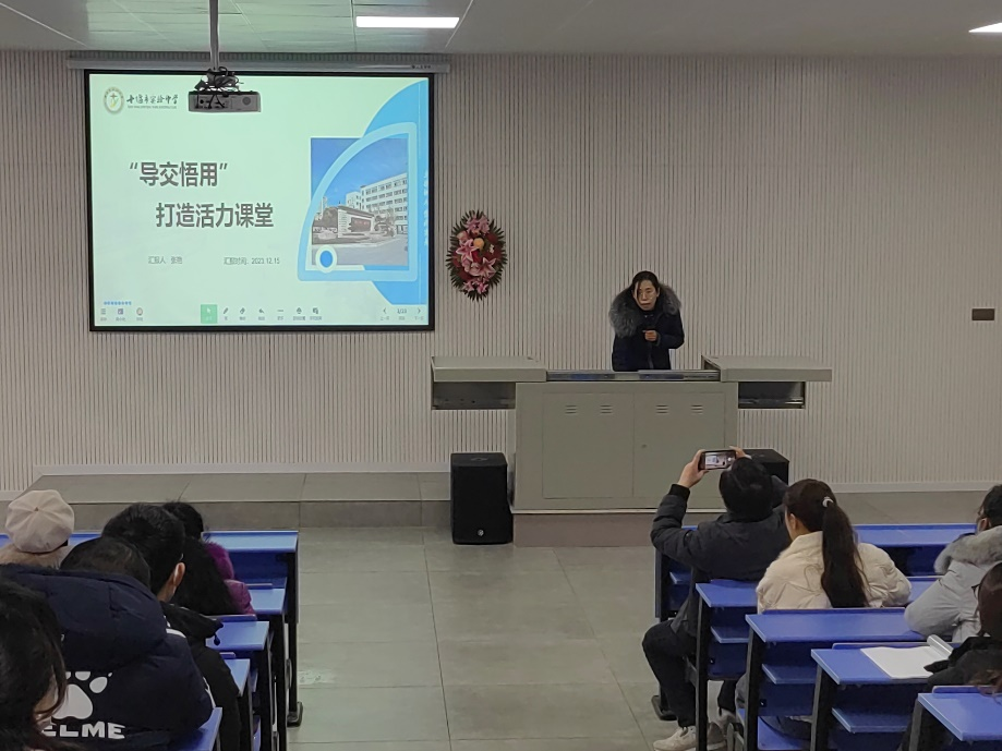 其次,十堰市实验中学张艳教师以“导交悟用”打造活力课堂为主题分享了相关教学心得。张艳老师一方面从“导”—目标导学,明确方向、“交”—交流互动,探究新知、“悟”—领悟思想,整体建构、“用”—训练应用,积累经验四个环节展示了践行以生为主的课堂操作流程。另一方面从议题式教学、活动式教学、情境式教学、体验式教学等多样化的教与学方式探讨了如何打造活力课堂,激发学生学习积极性和主动性的教学经验。