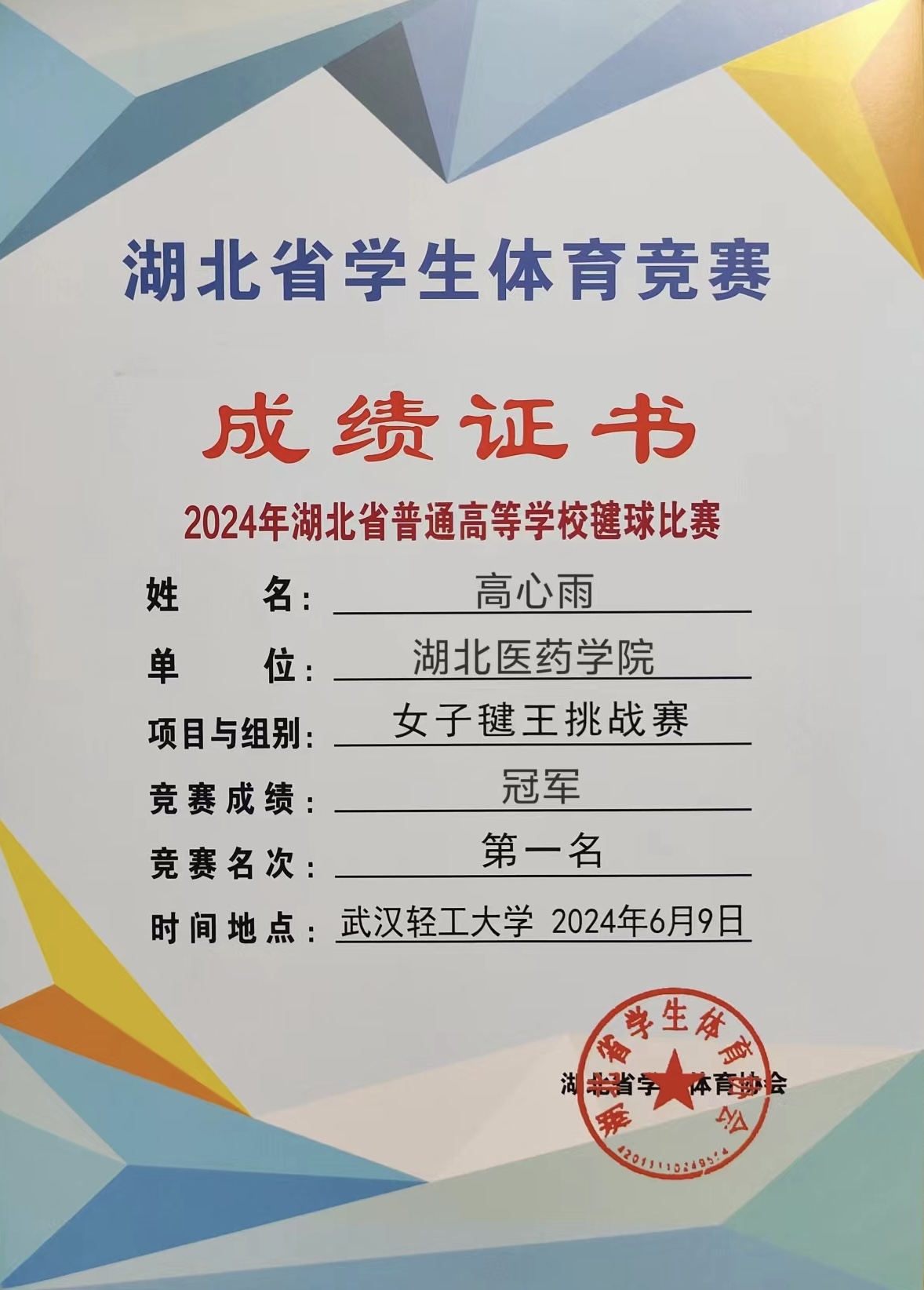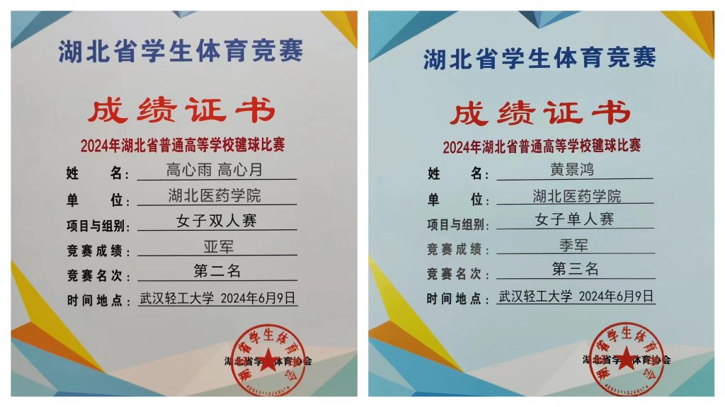 本网讯(通讯员 王于桦)6月8日-9日,由湖北省大学生体育协会主办,武汉轻工大学承办的2024年湖北省普通高等学校毽球比赛在武汉轻工大学体育馆举行。英国上市公司365毽球队高心雨、高心月、黄景鸿三名队员在教练员王于桦老师的带领下参赛,经过两天激烈的角逐,英国上市公司365取得了毽王赛冠军、女子双人赛第二名、女子单人赛第三名、女子团体赛第三名的优异成绩。