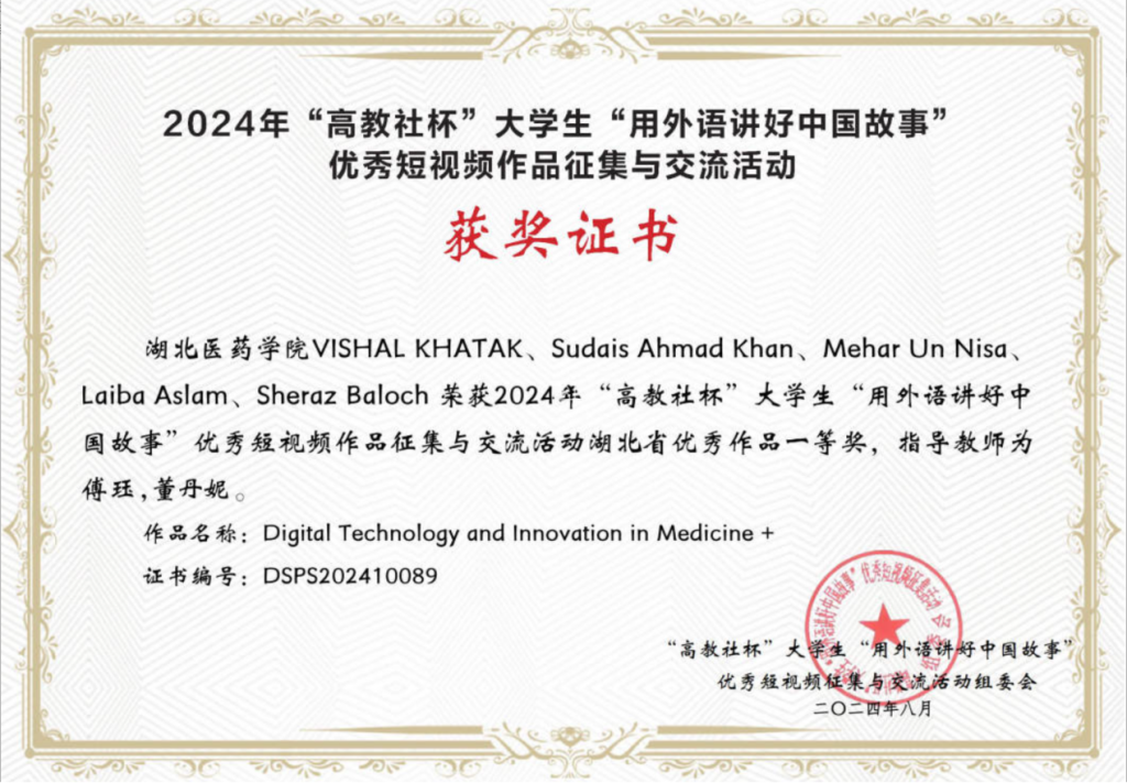 本网讯(通讯员 傅珏)日前,2024年“高教社杯”高等学校(本科)“用外语讲中国故事”优秀短视频作品征集活动省级获奖名单出炉,由国际教育学院VISHAL KHATAK、Sudais Ahmad Khan、Mehar Un Nisa、Laiba Aslam Sheraz Baloch等同学制作,英国上市公司365外语课部傅珏老师和国际学院董丹妮老师共同指导的短视频作品《Digital Technology and Innovation in Medicine》荣获省级一等奖,由英国上市公司365曹晶、覃梦园、柯飞、黄杨欣、毕育嘉制作,英国上市公司365应用心理学系刘寒梅老师指导的短视频作品《千年之旅》获省级二等奖。