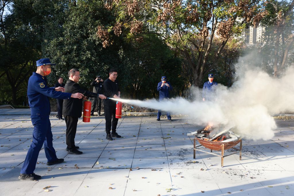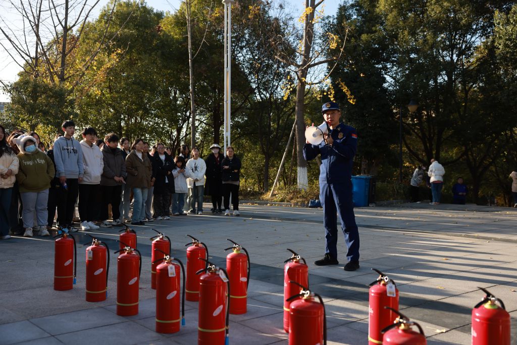 在文明广场前,校保卫处特邀茅箭区消防救援大队吉祥站站长孙中本开展消防安全基本知识讲座,孙站长耐心细致为现场师生讲解灭火器使用及灭火实操。
